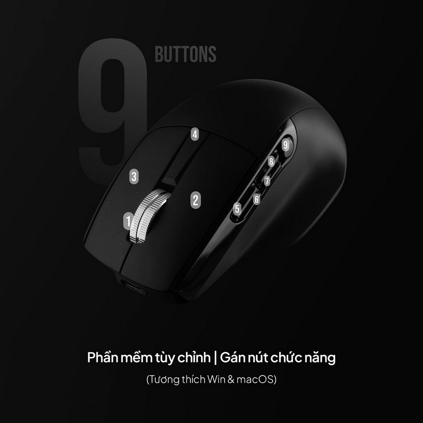 Phần mềm đi kèm cho phép người dùng lập trình lại toàn bộ 9 nút bấm, hỗ trợ ghi và thực thi macro phức tạp với độ trễ chính xác từng millisecond, đồng thời lưu được 3 profile trực tiếp trên bộ nhớ chuột. Switch silent có độ bền công bố 5 triệu lần nhấn, kết nối hỗ trợ đầy đủ 3 chế độ Bluetooth, 2.4 GHz wireless và có dây Type-C. Thời lượng pin thực tế khoảng 2 tháng chỉ với một lần sạc (tùy cường độ sử dụng).