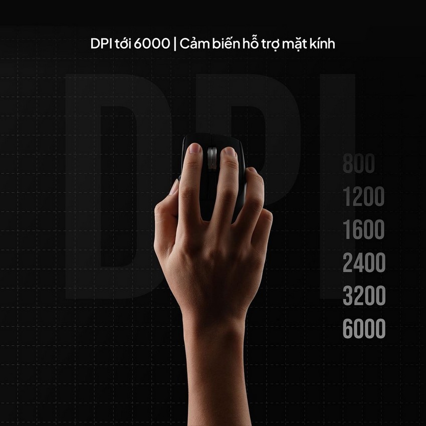 HyperWork Macro sử dụng cảm biến PixArt cao cấp, cho khả năng di chuột mượt mà và chính xác ngay cả trên bề mặt kính – điều mà nhiều mẫu chuột cùng tầm giá vẫn chưa làm tốt. Độ phân giải DPI có thể điều chỉnh linh hoạt trong khoảng 800–6000 và thay đổi trực tiếp trên chuột mà không cần mở phần mềm. Màn hình OLED mini sẽ hiển thị tức thì mức DPI hiện tại, phần trăm pin còn lại cùng biểu tượng chế độ kết nối đang sử dụng.
