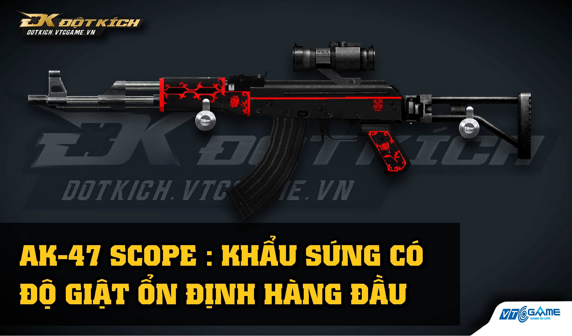 Có thể nói, đây là 1 trong những phiên bản được cộng đồng game thủ đánh giá đẹp nhất của dòng súng AK-47. AK-47 Scope được thiết ké với tông màu đen làm chủ đạo, nổi bật với viền màu đỏ chạy ngang thân súng và tích tụ tại ốp tay và cán súng giúp khẩu súng này trở lên càng chất lượng hơn bao giờ hết.