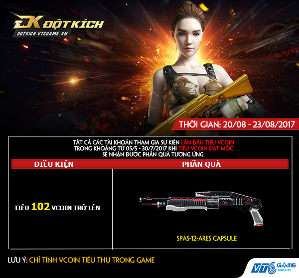 Một khi đã sở hữu Spas-12 Slug Ares thì chắc chắn bạn sẽ không phải hối tiếc vì những gì mình đã bỏ ra bởi độ bá đạo cũng như uy lực mạnh mẽ mà nó mang lại cho người sở hữu. Và hiện tại, vũ khí Slug đình đám này đã chính thức lên kệ quà tặng, các xạ thủ sẽ có cơ hội sở hữu Spas-12 Ares chỉ với 102 Vcoin bằng cách tham gia sự kiện dưới đây.