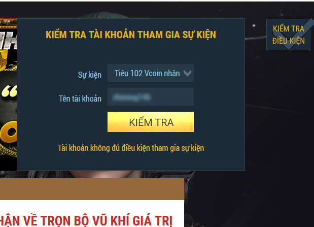 Hệ thống trả về thông báo tài khoản này không đủ điều kiện tham gia sự kiện Tiêu 102 Vcoin