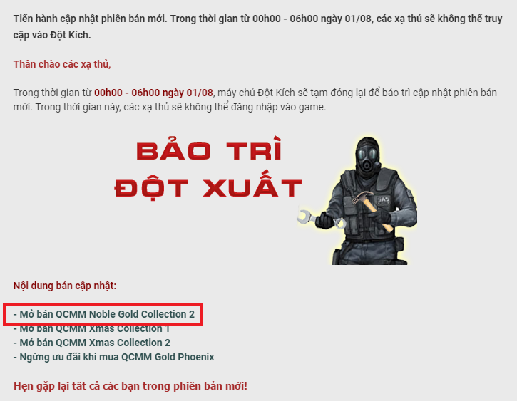 Trước đây tại bản cập nhật mang số hiệu 1248 đã đem đến cho chúng ta một QCMM thực sự gây chấn động chính là Noble Gold Collection 1 bao gồm: Barrett Born Beast-Noble Gold và Kukri Beast-Noble Gold. Tuy nhiên, bởi thời gian xuất hiện của QCMM này quá ngắn nên vẫn còn nhiều xạ thủ vẫn chưa sở hữu được món vũ khí mà mình yêu thích.