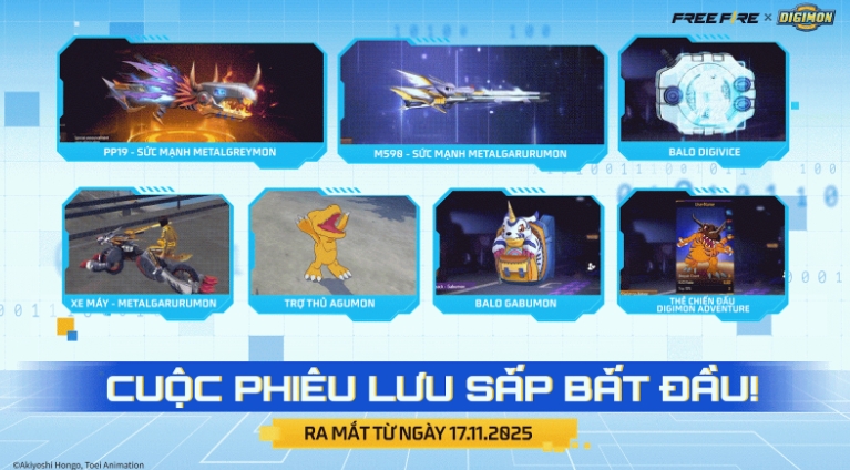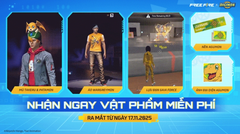 Sự kiện hợp tác giữa Free Fire và Digimon Adventure đã bắt đầu từ ngày 17/11/2025, mang thế giới Digital Monster quen thuộc từ anime kinh điển vào bản đồ battle royale.