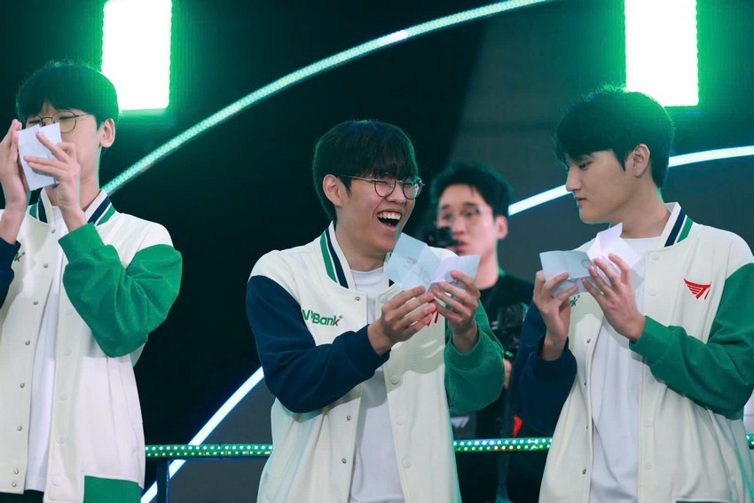 Biểu cảm của các tuyển thủ T1 khi bốc thăm vị trí thi đấu.