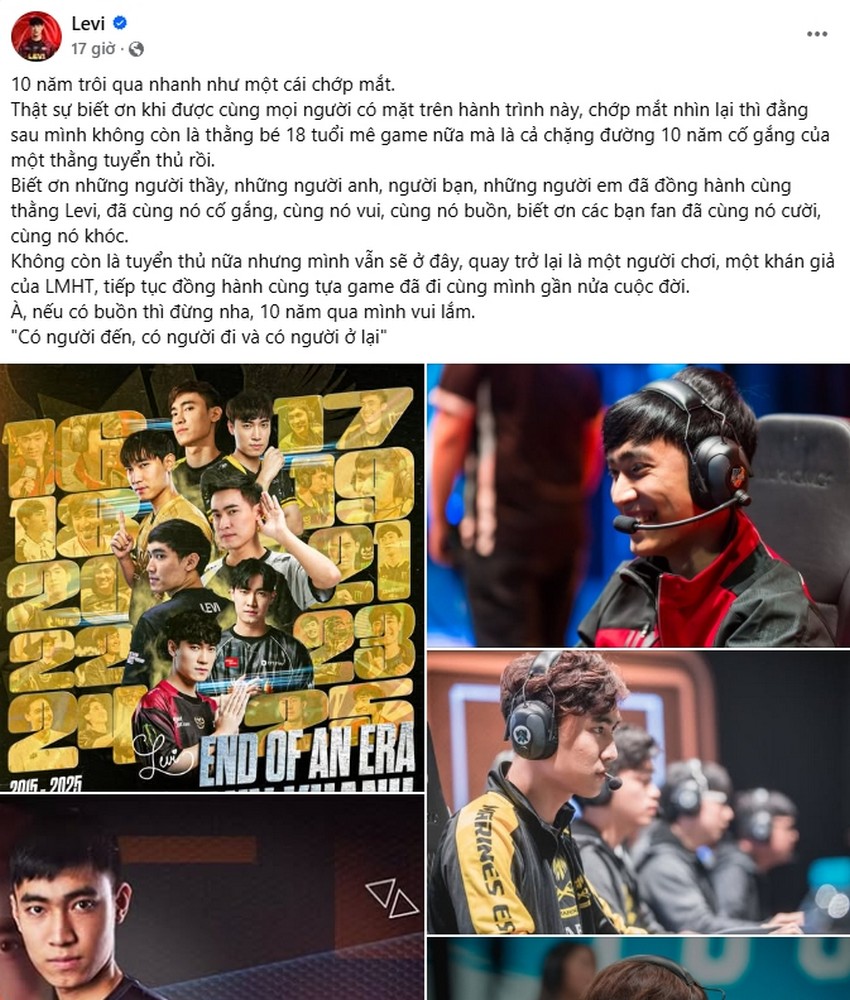 “Cảm ơn thầy cô, gia đình, đồng đội, bạn bè và đặc biệt là các bạn – những người đã đồng hành cùng mình suốt chặng đường dài. Dù không còn là tuyển thủ nữa nhưng mình vẫn sẽ ở đây, vẫn chơi LMHT, vẫn là khán giả của các bạn”, Levi nghẹn ngào.