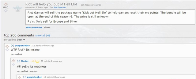 Cụ thể, theo như tiết lộ của tài khoản có tên RiotFreeman trên diễn dàn chia sẻ thông tin lớn nhất thế giới là Reddit, anh cho biết rằng Riot Games trong thời gian tới sẽ mở bán một thẻ trong cửa hàng Liên Minh Huyền Thoại với tên gọi là “Thoát khỏi Hell Elo” – Nguyên văn “Kich Out Hell Elo”. Được biết chức năng của thẻ này sẽ giúp game thủ đang bị Hell Elo sẽ reset lại điểm Elo cho bằng điểm Elo trung bình của thứ hạng đó (vẫn giữ nguyên cấp bậc hiện tại). Tuy nhiên giá trị mua bán của thẻ này vẫn chưa được tiết lộ.