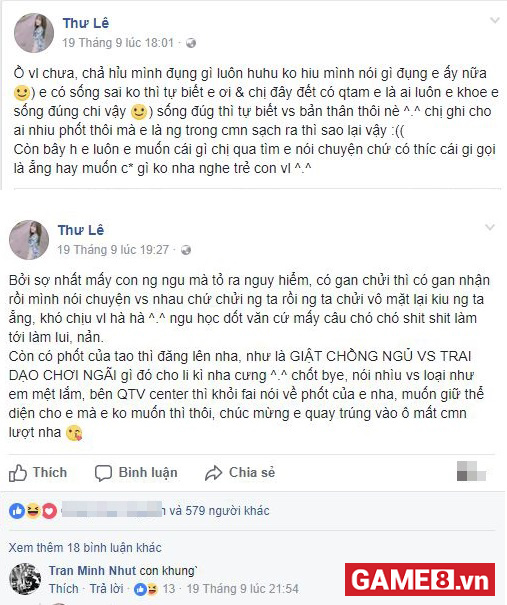 Ngay sau khi nhận được status "chửi" thẳng mặt mình là "dựa hơi kiếm fame" của Hoa Hà, Thư Lê tỏ ra vô cùng bức xúc và chụp toàn bộ status của Hoa Hà kèm dòng trạng thái trên trang Facebook cá nhân. Theo đó, bạn gái Junie cũng đưa ra 1 vài "phốt" lớn của cô nàng Hoa Hà cũng như ở nơi làm việc cũ QTV Center trước khi chuyển đến Marines Esports.