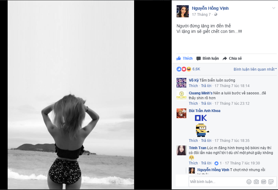 Không những vậy, gần đây trên Facebook của Shin Hồng Vịnh đăng tải những bức ảnh rất tâm trạng về cuộc sống cũng như chuyện tình cảm khi mà mới đây là bức ảnh của Shin kèm dòng chữ "Người đừng lặng im đến thế / Vì lặng im sẽ giết chết con tim...!!!" - nhìn vào dòng trạng thái này có thể biết rằng Shin đang có chuyện buồn trong tình yêu với QTV.