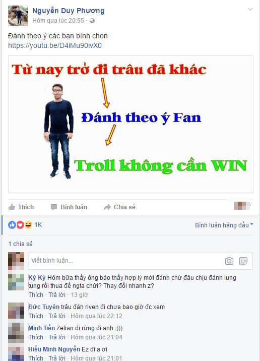 Mới đây, Trâu Best Udyr đã có những chia sẻ trẻn trang Facebook cá nhân xung quanh việc sẽ thay đổi khi chơi game theo ý fan vui vẻ không quan trọng thắng thua. Chỉ vài phút đăng tải bài viết đã được khá nhiều sự quan tâm từ phía fan hâm mộ, bởi lẽ rất nhiều người theo dõi stream của Trâu đã lâu nhưng các trận đấu vì cày thuê nên sẽ đè nặng việc thắng thua để sớm trả tài khoản cho khách. Cũng nhiều yêu cầu từ phía game thủ mong Trâu đánh các vị tướng theo yêu cầu, tướng dị đi rừng hay Soraka lên AD trong vai trò xạ thủ chả hạn.