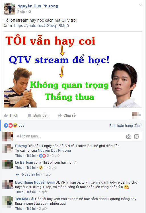 Có lẽ rằng Trâu cũng biết được để có được thành công lâu dài sự nổi tiếng cho mình thì fan hâm mộ là thứ quan trọng nhất. Như QTV, anh đánh không xuất sắc nhất mà 2 năm trở lại đây QTV mới trở lại được mốc Thách đấu nhưng khi hỏi 1 game thủ ai là game thủ nổi tiếng nhất Việt Nam thì chắc chắn đáp án không ai khác chính là "già dơ" QTV. Trâu cũng chia sẻ về việc cũng xem stream của QTV khi mình không online stream và học cách đánh không quan trọng thắng thua.