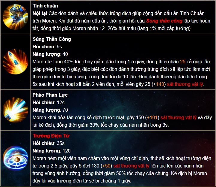 Moren là một đại sư cơ khí thích nhậu nhẹt và ưa dùng súng để nói chuyện, Moren là là một xạ thủ rất "trâu bò" trong các giao tranh, đây hứa hẹn là một vị xạ thủ đáng sợ trong đấu trường Liên Quân Mobile.