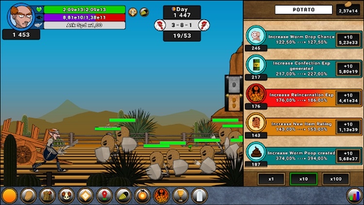 Trong giai đoạn đầu của trò chơi, bạn sẽ có hai loại tiền tệ chính: Khoai tây và Skulls. Bạn có thể sử dụng chúng để nâng cấp hơn 30 chỉ số khác nhau hoặc mua các cải tiến cho khoai tây. Tuy nhiên, đó chỉ là bước khởi đầu của cuộc phiêu lưu.