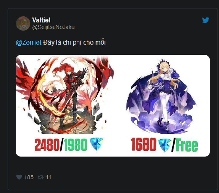 Trang phục của Diluc cũng sẽ có trong sự kiện với giá chiết khấu là 1980 Pha lê, nhưng cả hai trang phục sẽ có giá rất lớn là Pha lê Genesis sau khi sự kiện kết thúc. Trang phục của Fischl sẽ có giá 1680 Genesis Crystals, trong khi của Diluc sẽ có giá 2480.