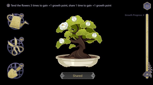 Bạn có thể kiểm tra quá trình phát triển của cây hoa. Nhấp vào nút chia sẻ ở cuối màn hình sự kiện. Khi đạt đến cấp độ tăng trưởng 4, bạn có thể bắt đầu thực hiện các nhiệm vụ sự kiện trong danh sách việc cần làm.