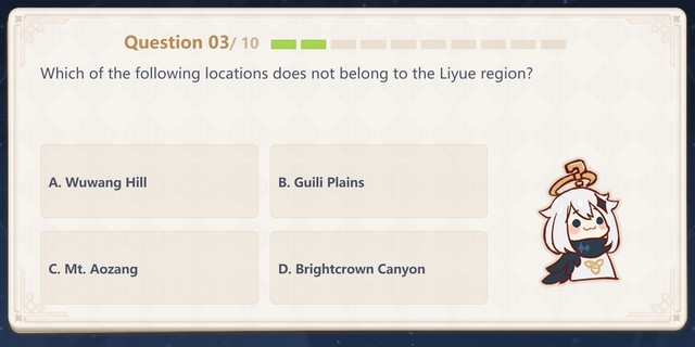 Ngoài sự kiện web When Flowers Bloom Genshin Impact, có một sự kiện đố vui khác dành cho tất cả người chơi mang tên 'Một nghìn câu hỏi cùng Paimon' là một sự kiện web có sẵn khác để người chơi Genshin Impact tham gia. Nhằm kiểm tra kiến thức của họ về trò chơi và cho phép người chơi kiếm được một lượng lớn Mora trong game.