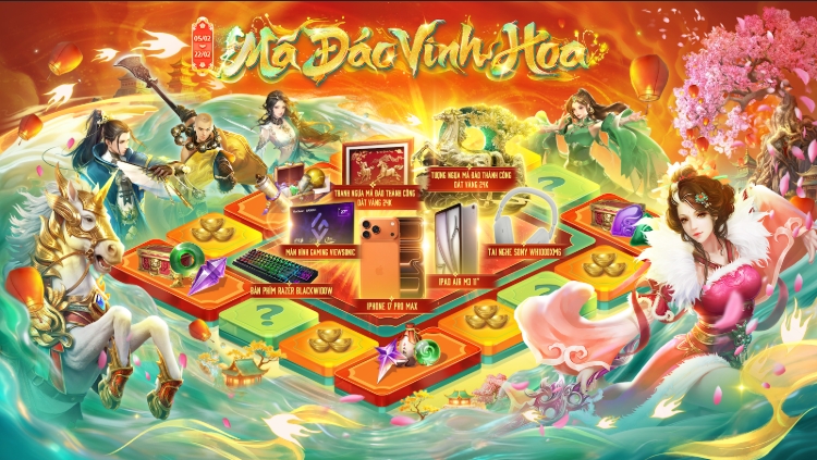 Ngoài phần thưởng trong game, người chơi còn có cơ hội nhận hiện vật thực tế qua rút thưởng, với tổng giá trị giải thưởng lên đến hàng trăm triệu đồng. Một số phần quà bao gồm Tranh Ngựa Mã Đáo Thành Công dát vàng 24K, Rượu ngựa Long Mã, iPhone 17 Pro Max 512GB, iPad Air M3 11 inch WiFi 256GB, cùng nhiều vật phẩm ingame khác.