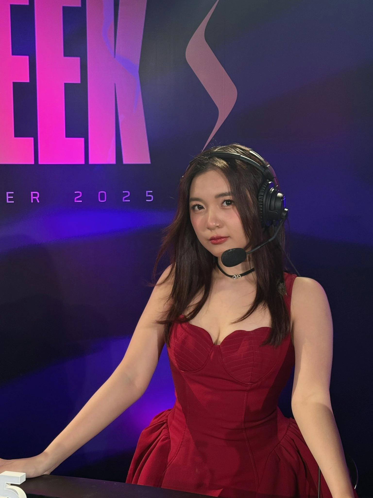 Mái tóc buông nhẹ tự nhiên kết hợp với lớp trang điểm trong trẻo giúp tôn lên khuôn mặt thanh tú, ánh mắt sáng và nụ cười rạng rỡ – những nét đặc trưng khiến khán giả luôn nhớ đến MC Phương Thảo. Điểm nhấn là tai nghe và micro chuyên dụng, biểu tượng quen thuộc của các MC eSports chuyên nghiệp, càng làm nổi bật hình ảnh một nữ MC vừa duyên dáng vừa bản lĩnh trong thế giới thể thao điện tử sôi động.
