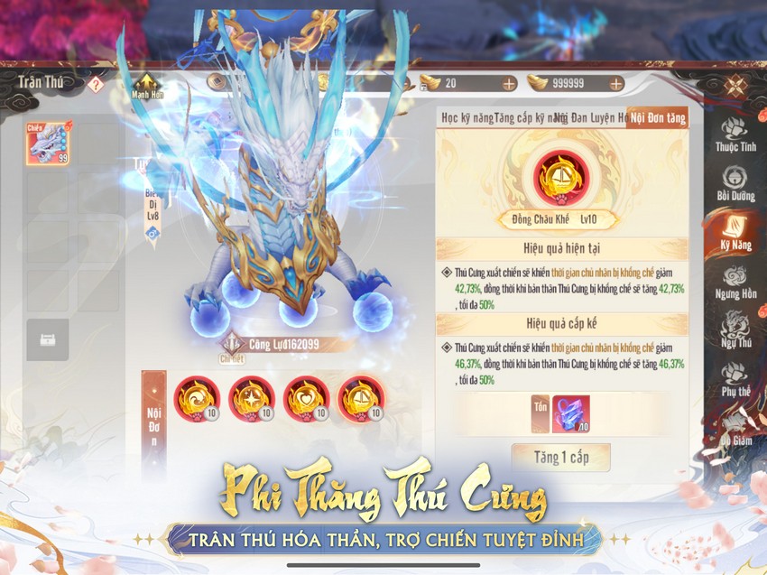 Tính năng Phi thăng thú cưng mở khóa ở Phá cảnh lv49 cho phép nâng thú cưng từ bậc cam lên bậc đỏ. Toàn bộ chỉ số kháng, sinh lực và công lực tăng mạnh, đồng thời mở thêm khe Nội đơn để gắn kỹ năng phụ trợ. Trong meta Vân Uyên tranh bá hiện tại, thú cưng đỏ gần như là yêu cầu bắt buộc để cạnh tranh ở các bảng cao.