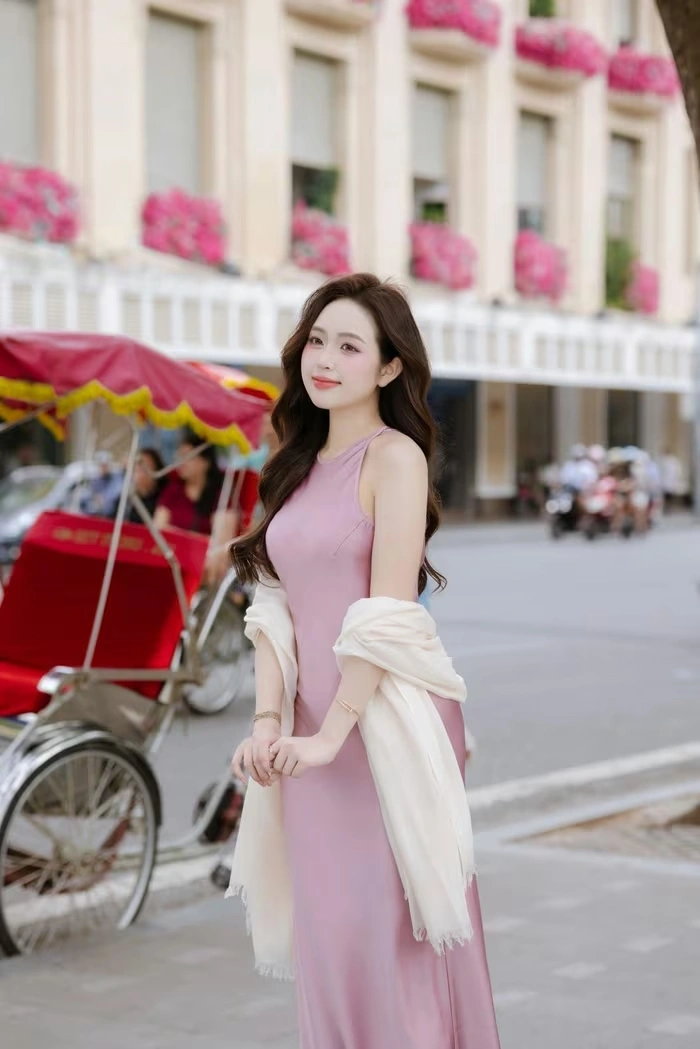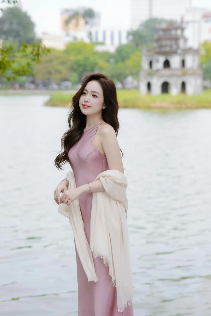 Điểm nhấn của bộ ảnh chính là chiếc váy lụa màu hồng pastel ôm dáng. Chất lụa mềm mại chảy theo từng đường cong cơ thể, khoe khéo vòng eo con kiến và đôi chân thon dài. Màu pastel nhẹ nhàng hòa quyện với không khí thu, tạo cảm giác ngọt ngào mà không hề lố. Khăn choàng trắng mỏng tang được khoác hờ trên vai không chỉ giữ ấm trong tiết trời se lạnh mà còn là phụ kiện nâng tầm sự nữ tính, tinh tế.