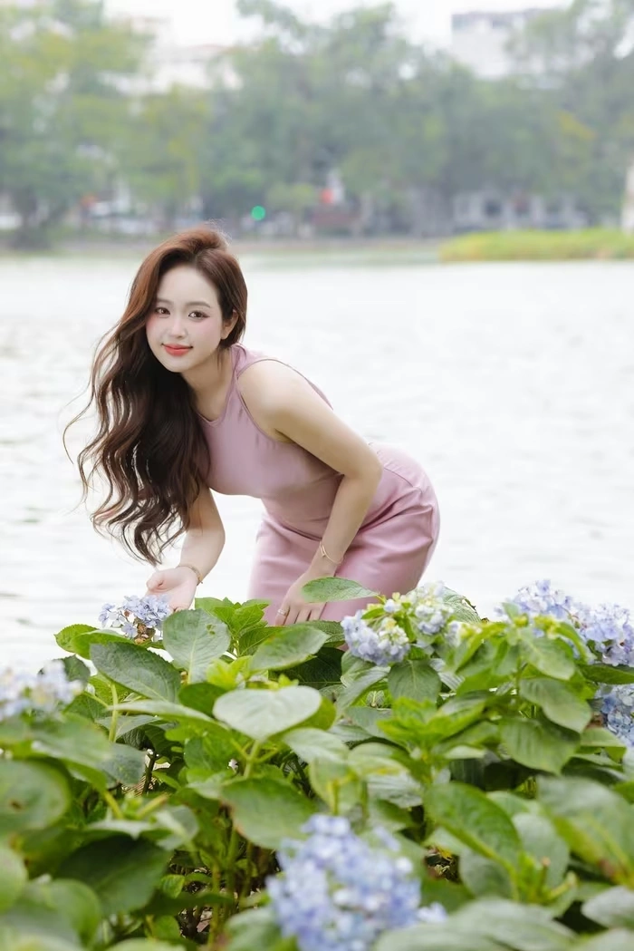 Dù bước sang tuổi 28 và trải qua hai lần sinh nở, Lê Phương Anh vẫn giữ được làn da trắng hồng mịn màng như thiếu nữ. Lớp trang điểm mỏng nhẹ chỉ nhấn nhẹ vào đôi mắt long lanh và đôi môi căng mọng, giúp gương mặt toát lên vẻ dịu dàng, đằm thắm. Kiểu tóc uốn gợn sóng tự nhiên buông xõa vai càng tôn thêm nét thanh thoát, khiến “Cún” trông như vừa bước ra từ bức tranh thủy mặc mùa thu.