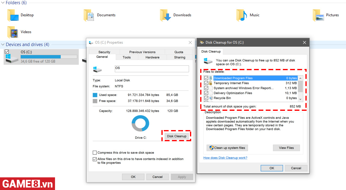 Vào This PC -> Chuột phải ổ C chọn properties -> Chọn Disk Cleanup -> Tích hết các mục lựa chọn -> bấm OK.