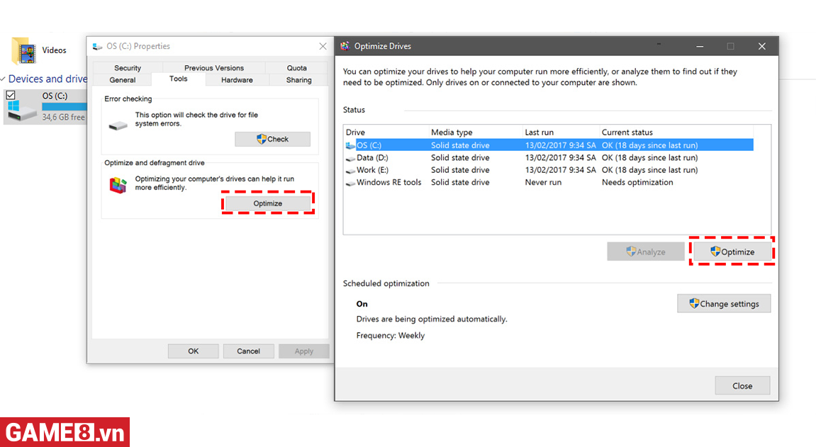 Vào This PC -> Chuột phải ổ C chọn Properties -> Chuyển sang tab Tools -> Chọn Optimize -> Chọn Optimize