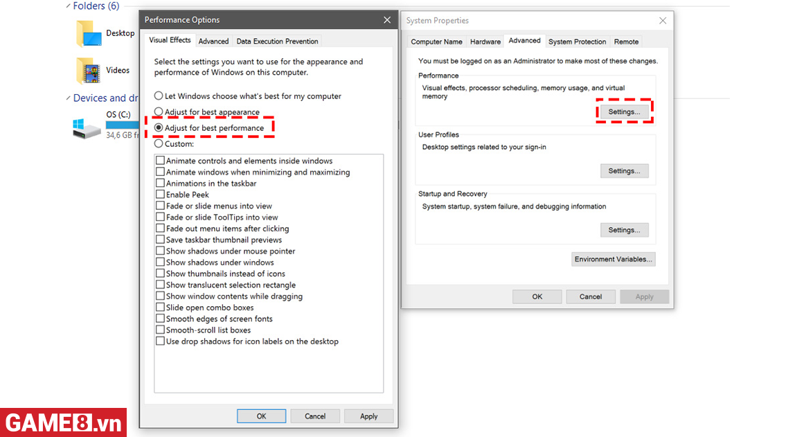 Vào Control Panel -> Chọn Systems -> Chọn Advance system settings -> Tại tab advance chọn settings ở ô Performance -> Adjust for best performance