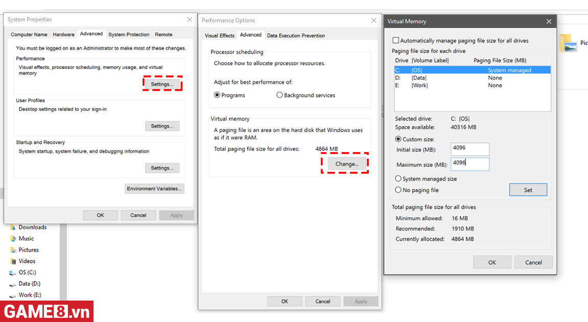 Vào Control panel -> Chọn Systems -> Chọn Advance system settings -> Tại tab Advance chọn Settings ở ô Performance -> Chuyển sang tab Advance -> Bỏ Automatically manage paging file size for all drives -> Tại Custom size chuyển Intinal size và Maximum size lên mức Recommended