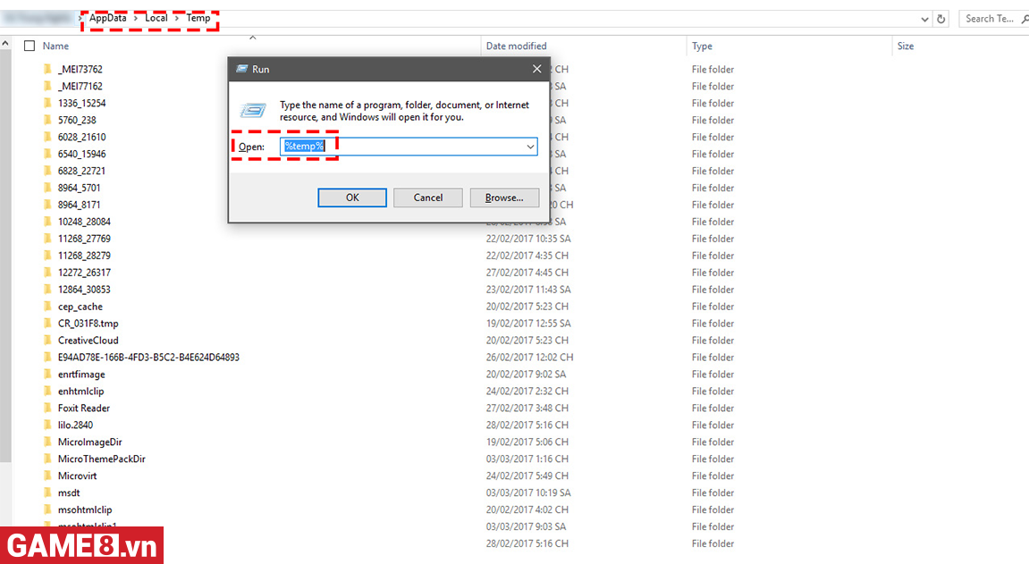 Sử dụng tổ hợp phím window + R mở bảng chọn Run -> Gõ %temp% -> Xóa hết file