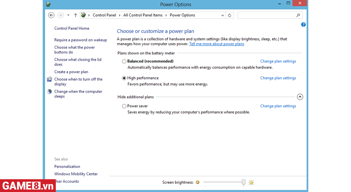 Vào control panel -> Chọn Hardware and Sound -> chọn Power Options -> High performance