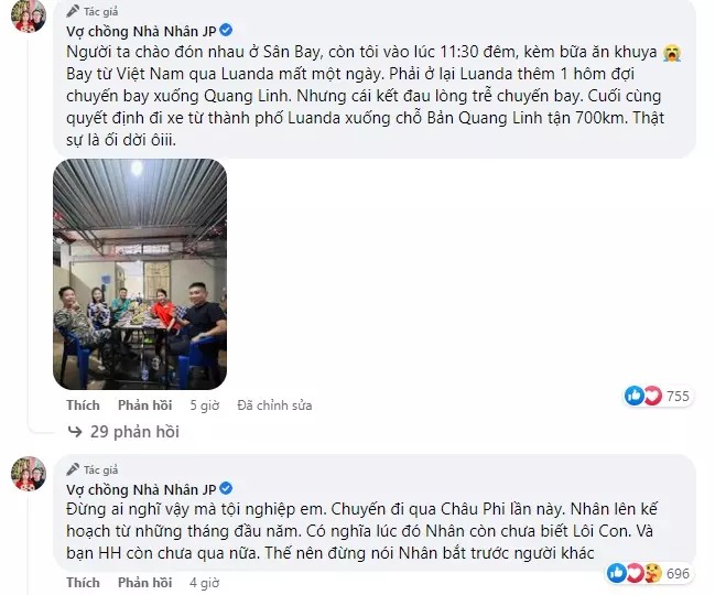 Dưới bài viết, bà Nhân Vlog chia sẻ thêm hình ảnh bữa cơm đầu tiên tại châu Phi cùng những người đồng hương. Kèm theo, nữ YouTuber tiết lộ trong hành trình sang được nơi ở của Quang Linh đã gặp một số khó khăn.