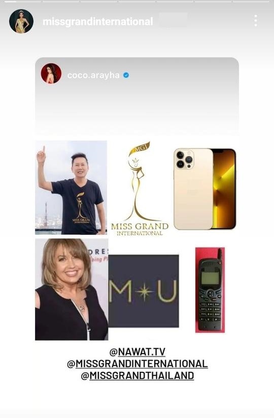 Trên trang chủ của MGI vừa có động thái bị cho là "cà khịa" cuộc thi đối thủ khi chia sẻ lại một bài đăng so sánh giữa 2 đương kim Hoa hậu. Trong khi Miss Universer bị ví như "chiếc điện thoại cũ", thì Miss Grand lại được khen là "điện thoại thông minh đời mới", ngầm ám chỉ đẳng cấp "chọn người" của Miss Grand hơn hẳn với tiêu chuẩn "cũ kỹ" của Miss Universe.