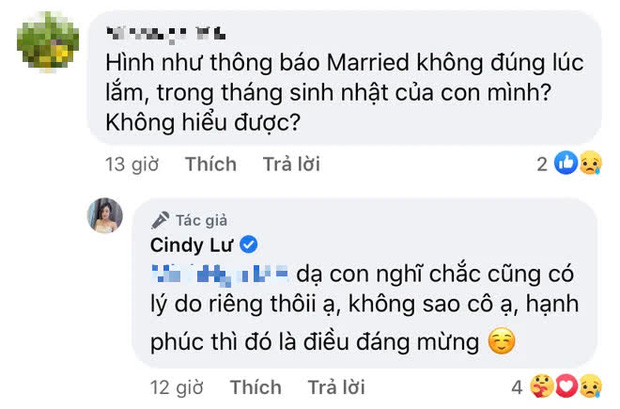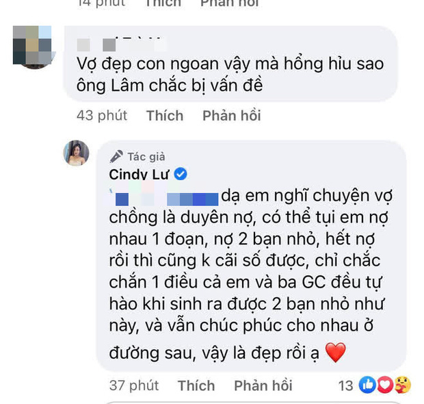 Mặc dù ly hôn đã lâu, nhưng Cindy Lư vẫn sẵn sàng đứng ra bảo vệ chồng cũ. Ngay dưới bình luận chỉ trích Hoài Lâm, Cindy Lư đáp lễ phép: "Dạ con nghĩ chắc cũng có lý do riêng thôi ạ, không sao cô ạ, hạnh phúc thì đó là điều đáng mừng". Tuy nhiên, sau khi người này tiếp tục nhắc về những câu hát mà Hoài Lâm từng dành tặng cho con gái, Cindy Lư lại không bình luận gì mà chỉ lặng lẽ thả biểu tượng cảm xúc "buồn". Tuy vậy, cô vẫn được nhiều người bênh vực vì dành sự tôn trọng cho chồng cũ.