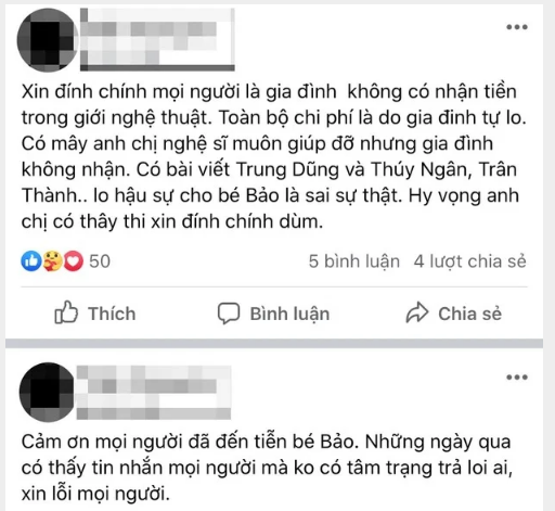 "Xin đính chính mọi người là gia đình không có nhận tiền trong giới nghệ thuật. Toàn bộ chi phí là do gia đình tự lo. Có mấy anh chị nghệ sĩ muốn giúp đỡ nhưng gia đình không nhận. Có bài viết Trung Dũng và Thúy Ngân, Trấn Thành,... lo hậu sự cho bé Bảo là sai sự thật. Hy vọng anh chị có thấy thì xin đính chính giúp", người thân Ốc Bảo Bảo lên tiếng.