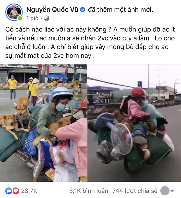 "Có cách nào liên lạc với anh chị này không? Anh muốn giúp đỡ anh chị ít tiền và nếu anh chị muốn, anh sẽ nhận 2 vợ chồng vào công ty anh làm, lo cho anh chị chỗ ở luôn. Anh chỉ biết giúp vậy mong bù đắp cho anh chị sự mất mát của 2 vợ chồng hôm nay" - Nguyễn Quốc Vũ chia sẻ trên trang cá nhân.