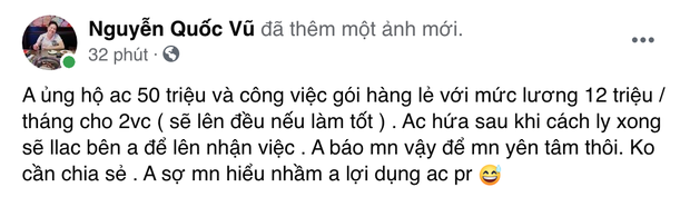 Sau vụ việc trên, mới đây một đại gia tên Nguyễn Quốc Vũ - chồng của ca sĩ Đoàn Di Băng đã có một bài đăng trên trang cá nhân và nhận được sự ủng hộ của nhiều người. Cụ thể, đại gia Quận 7 muốn nhờ mọi người tìm giúp thông tin của vợ chồng chú Hùng để giúp đỡ.