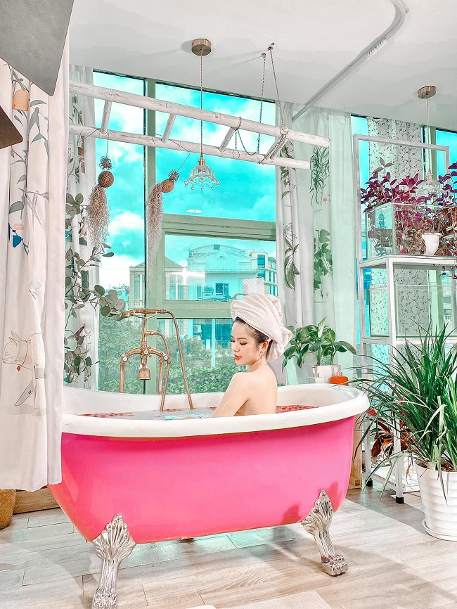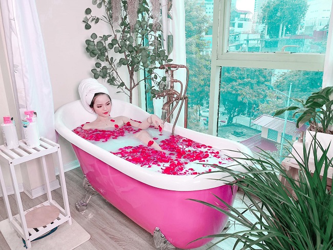 Hà Đan còn táo bạo khoe khoảnh khắc tắm bồn để lộ bờ vai trần gợi cảm.