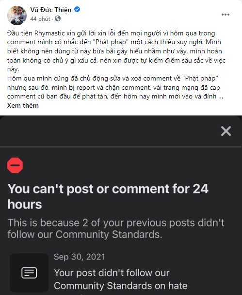 "Đầu tiên Rhymastic xin gửi lời xin lỗi đến mọi người vì hôm qua trong comment mình có nhắc đến "Phật pháp" một cách thiếu suy nghĩ. Mình biết không nên dùng từ này bừa bãi gây hiểu nhầm như vậy, mình hoàn toàn không có chủ ý gì xấu cả, nên xin được tự kiểm điểm sâu sắc về việc này.