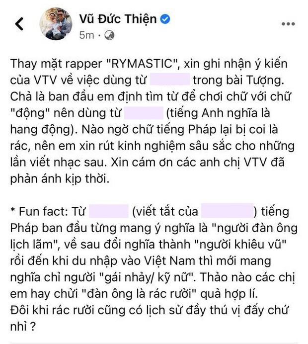 Đến sáng 30/9, Rhymastic đã có một bài đăng phản biện cho rằng "người nhà đài sống ở 'tầng' khác nên không dùng từ bậy bao giờ" dấy lên nhiều ý kiến trái chiều. Bên dưới bài đăng, nam rapper cũng không quên nhấn mạnh, từ ngữ mà anh sử dụng là theo tiếng Pháp và không mang nghĩa dung tục.