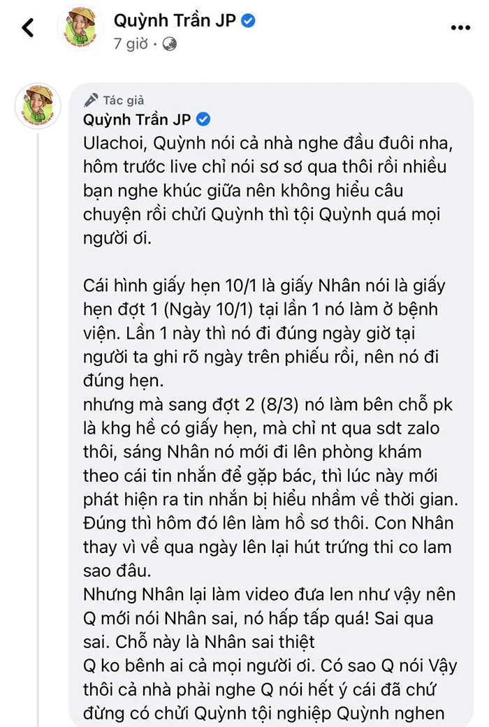 "Đúng là hôm đó Nhân chỉ lên làm hồ sơ thôi . Nếu Nhân quay về đợi ngày sau lên hút trứng thì có xảy ra chuyện gì đâu. Nhưng Nhân lại làm video đưa lên như vậy thì Quỳnh mới nói Nhân sai, nó hấp tấp quá! Sai quá sai. Chỗ này là Nhân sai thiệt . Quỳnh không bênh ai hết nhé mọi người. Có sao thì Quỳnh nói vậy thôi, cả nhà phải nghe Quỳnh nói hết chứ, đừng có chửi Quỳnh tội nghiệp Quỳnh" - Quỳnh Trần JP lần nữa đính chính thông tin bênh vực Bà Nhân Vlog.