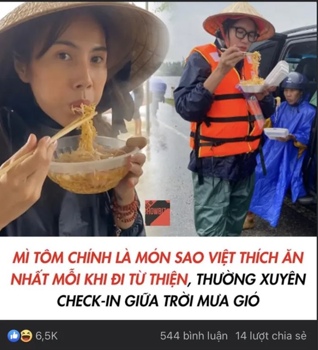 Trong đó, một bài đăng đã ghép ảnh Thuỷ Tiên và Trang Trần cùng ăn mì tôm kèm theo chú thích đầy mỉa mai: “Mì tôm chính là món sao Việt thích ăn nhất mỗi khi đi từ thiện, thường xuyên check in giữa trời mưa gió”. Bài đăng này nhanh chóng nhận được lượng tương tác khủng sau khi chia sẻ.