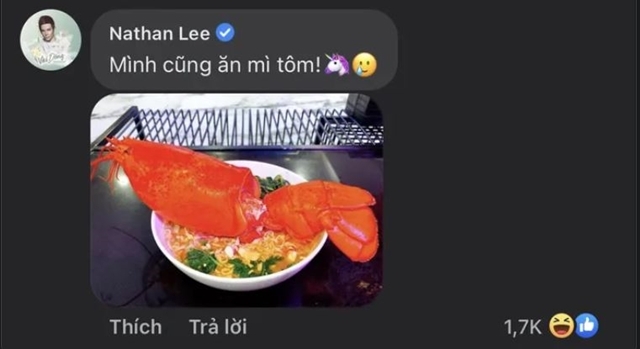 Đáng chú ý, nam ca sĩ Nathan Lee cũng vào “góp vui” để lại bình luận phía dưới bằng ảnh chụp bát mì với tôm hùm: “Mình cũng ăn mì tôm”. Cộng đồng mạng khá sửng sốt khi anh chàng vô tư tương tác với bài đăng châm chọc đồng nghiệp. Một số cho rằng, nam ca sĩ cũng đang muốn “cà khịa” Thủy Tiên và Trang Trần sau loạt lùm xùm sao kê tiền từ thiện. Tuy nhiên số đông lại nghĩ đó chỉ đơn giản là câu bông đùa, tính cách Nathan Lee trước đến nay cũng hài hước như vậy.