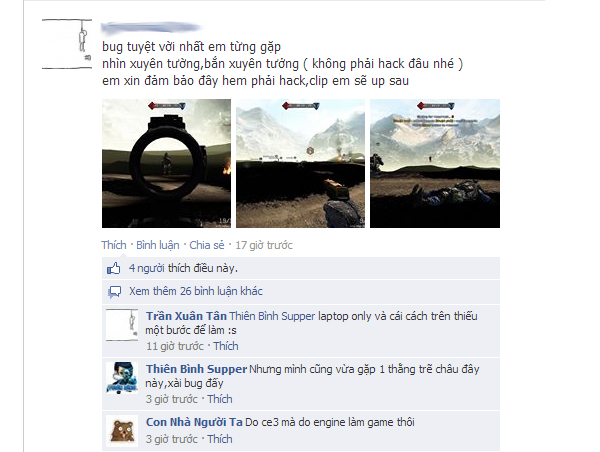 (Game8) - Mới đây, trên trang cộng đồng của Warface Việt Nam đã xuất hiện các bức ảnh của một game thủ thể hiện một bug mới giúp người chơi có thề nhìn và bắn xuyên tường. Các bức ảnh chụp chứng minh game thủ này đã có thể lợi dụng bug để chiến thắng, tuy vậy chủ nhân khẳng định đây là bug game chứ không phải cố tình hack game.