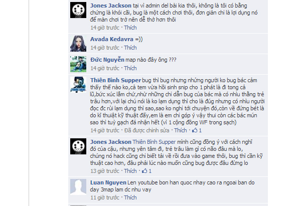 “bug thì bug nhưng những người ko bug bác cảm thấy thế nào ko,cả tem vừa hồi sinh snip cho 1 phát là đi tong cả lũ,bức xúc lắm chứ,nhừ những chỉ dẫn bug của bác mà có nhìu thằng trẻ trâu hơn,với lại chú nói là ko lạm dụng thì cho là đúg nhưng có nhìu người đọc đc rùi lạm dụng thì sao,sao ko nghỉ tới chuyện đó,còn về đứng bét là do kĩ thuật kỹ thuật đấy,em là em chỉ góp ý vậy thui còn các bác mún sao thì tuỳ gạch đá nhận hết (vì 1 cộng đồng WF trong sạch)” – thành viên Thiên Bình Supper phản bác.