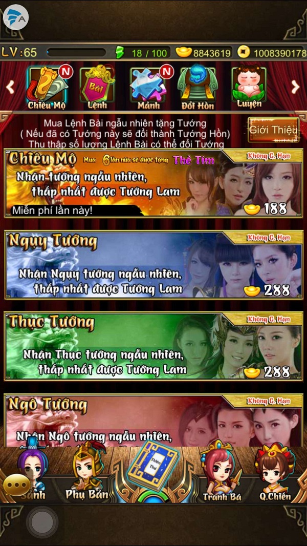 Tam Quốc 18+ là tựa game dựa trên cốt truyện Tam Quốc quen thuộc xoay cuộc chiến của những nhân vật chính như: Tào Tháo, Lưu Bị, Lão Bố,… Không chỉ lôi cuốn người chơi bởi những trận quốc chiến nóng bỏng, Tam Quốc 18+ còn hấp dẫn người chơi bởi việc sở hữu trong tay hơn 100 thẻ bài tương ứng với hơn 100 mỹ nữ nổi tiếng và đầy quyến rũ của Trung Quốc thời xưa.