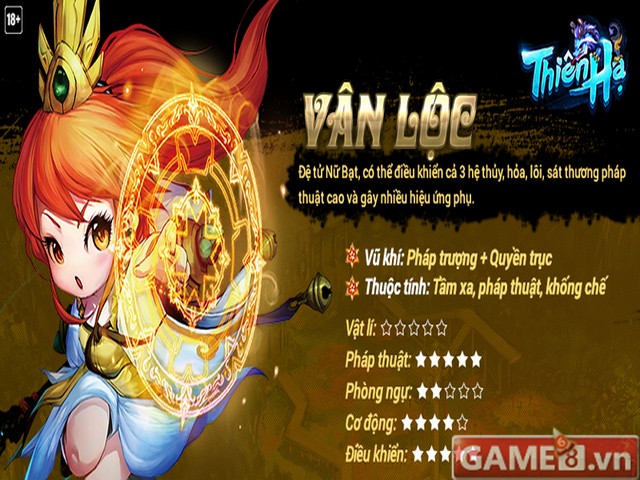 Đệ tử môn phái Vân Lộc Tiên ung dung tự tại, ngao du khắp chốn hồng trần mà vẫn thoát tục thanh tao, không nhiễm bụi trần. Thân mang trọng trách bảo vệ nhân gian, giữ gìn chính nghĩa, mỗi người trong số họ đều là cao thủ trong việc điều khiển ba nguyên tố lôi, thủy và hỏa để tiêu diệt yêu ma. Trong đó, lôi biểu thị cho sự tê liệt đối thủ, thủy tượng trưng cho sự uyển chuyển và hỏa chính là sức mạnh hủy diệt. Ba nguyên tố này bổ trợ cho họ trong phương diện tấn công, phòng thủ và khắc chế kẻ địch.
