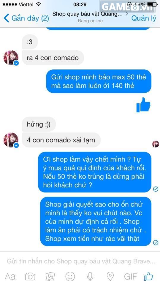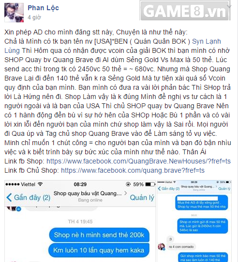 (Game8) - Bức xúc trước thái độ coi thường cộng đồng Đột Kích, coi thường khách hàng, rất nhiều bạn đọc đã gửi thông tin vụ việc Shop Quang Brave...