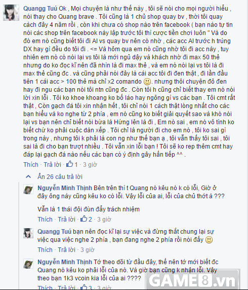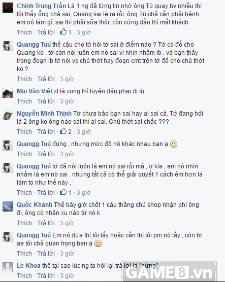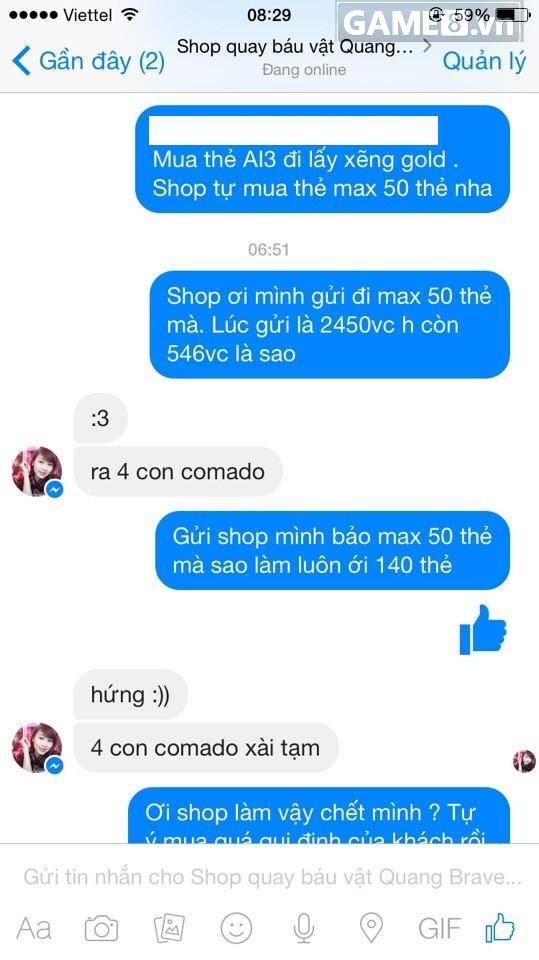 Thật khó có thể hiểu nổi tại sao, việc tiếp quá đến cả ngàn Vcoin của khách hàng, khách lịch sử hỏi "gửi shop mình bảo max 50 thẻ mà sao luôn ới 140 thẻ" lại nhận được một câu trả lời "hứng" rất thiếu tính xây dựng. Nhưng đó chưa phải là tất cả, ngay sau đó, Quang.Brave tiếp tục phát ngôn gây sốc bằng cách trả lời khó lòng chấp nhận nổi.