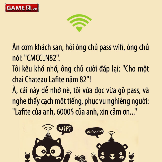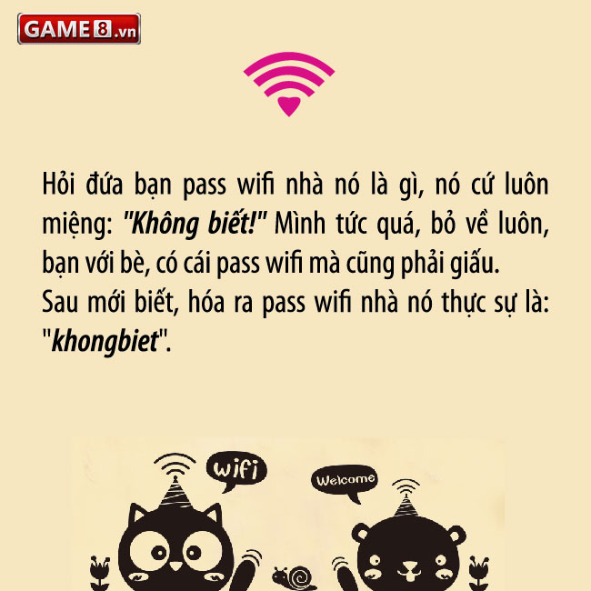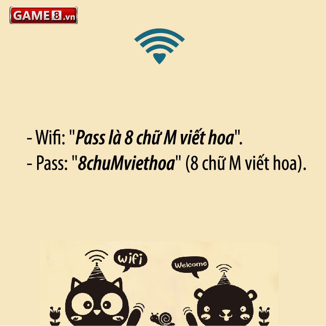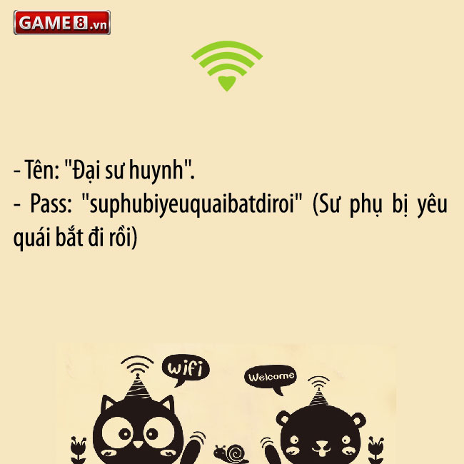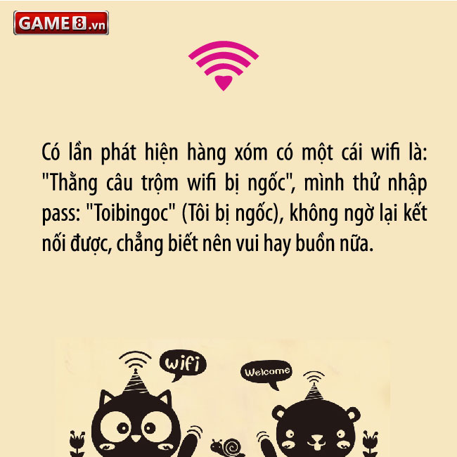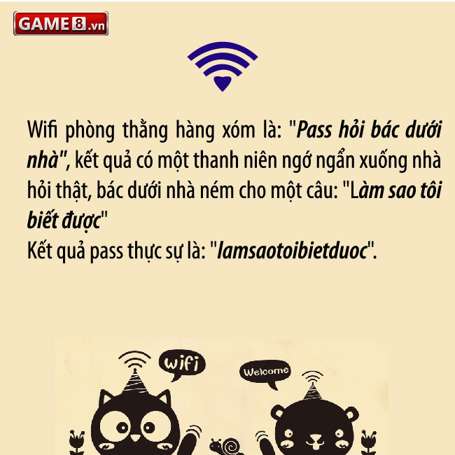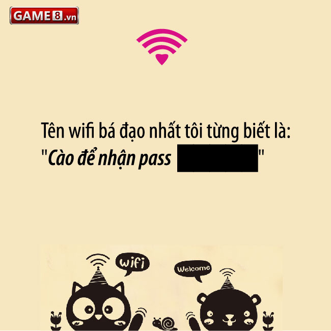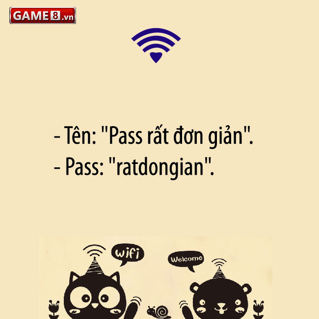 Thế nên, kiểu gì thì kiểu, thì đến đâu ta cũng phải dò rồi hỏi được pass wifi cho bằng được... Để màn hỏi pass thêm phần thi vị, nhiều chủ nhà đã nghĩ ra đủ cách hay ho cho mật khẩu wifi nhà mình "chất nhất quả đất", và lắm lúc ta không chỉ "mắt tròn mắt dẹt" hay phá lên cười, mà còn có thể tức "sôi máu" nữa.
