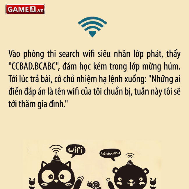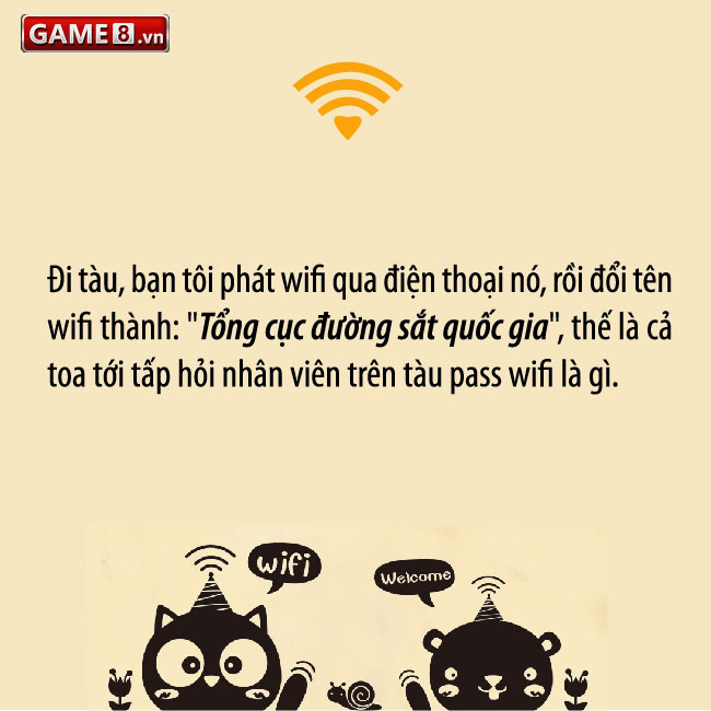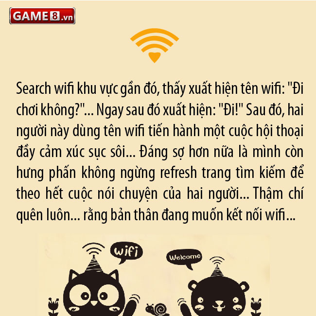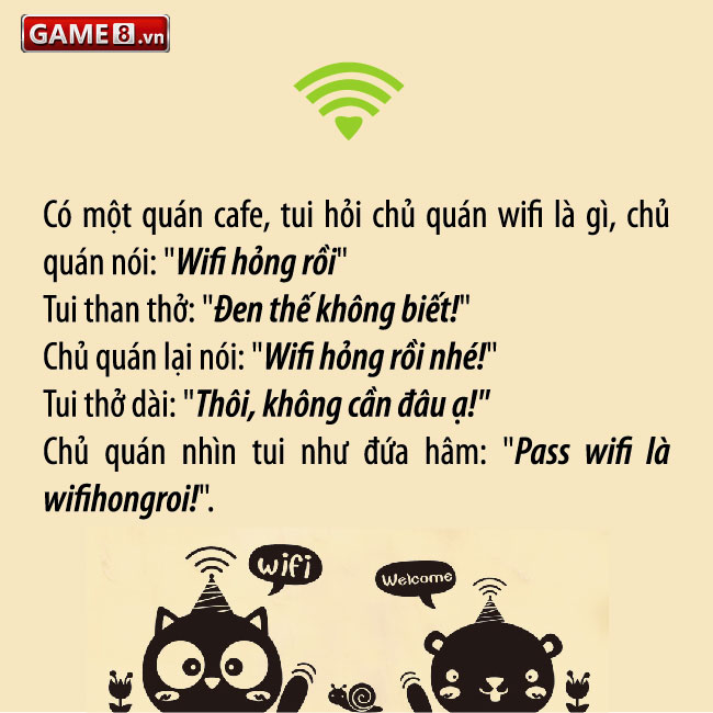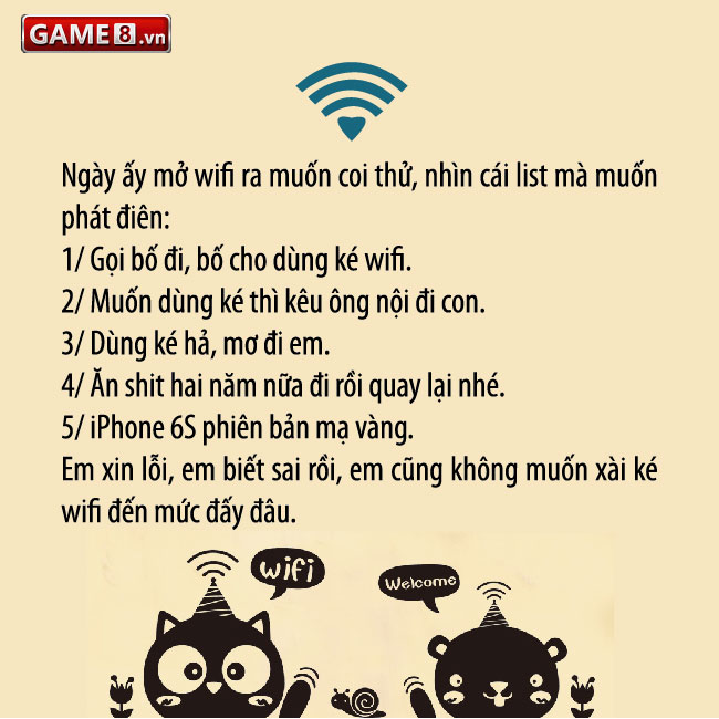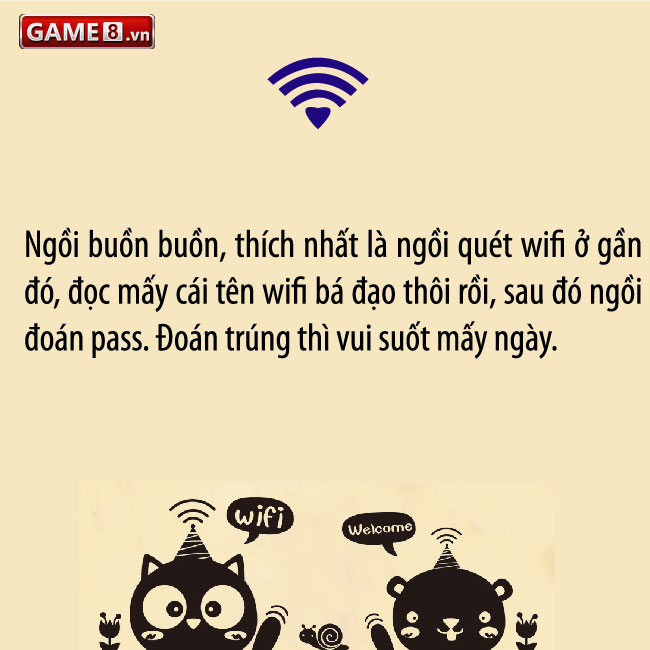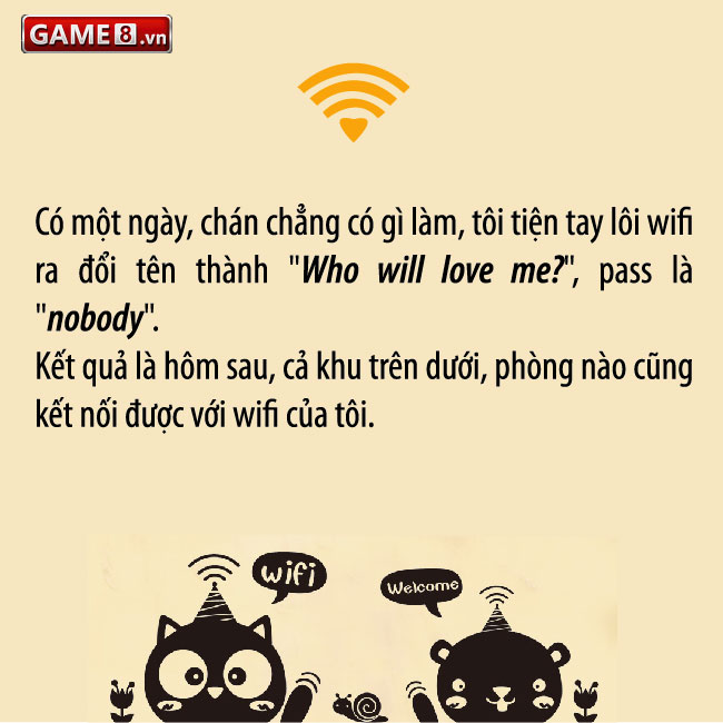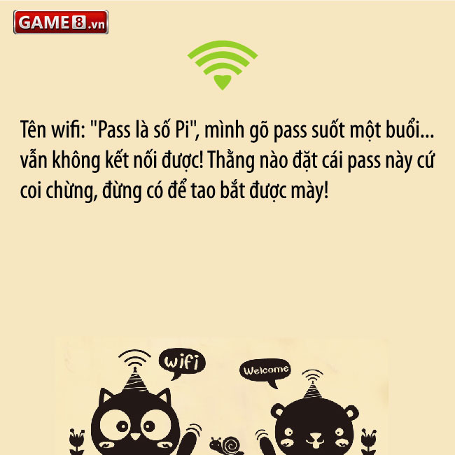 Thế nên, kiểu gì thì kiểu, thì đến đâu ta cũng phải dò rồi hỏi được pass wifi cho bằng được... Để màn hỏi pass thêm phần thi vị, nhiều chủ nhà đã nghĩ ra đủ cách hay ho cho mật khẩu wifi nhà mình "chất nhất quả đất", và lắm lúc ta không chỉ "mắt tròn mắt dẹt" hay phá lên cười, mà còn có thể tức "sôi máu" nữa.